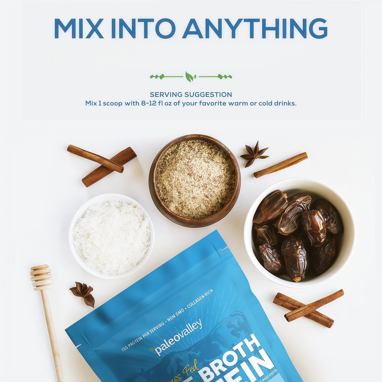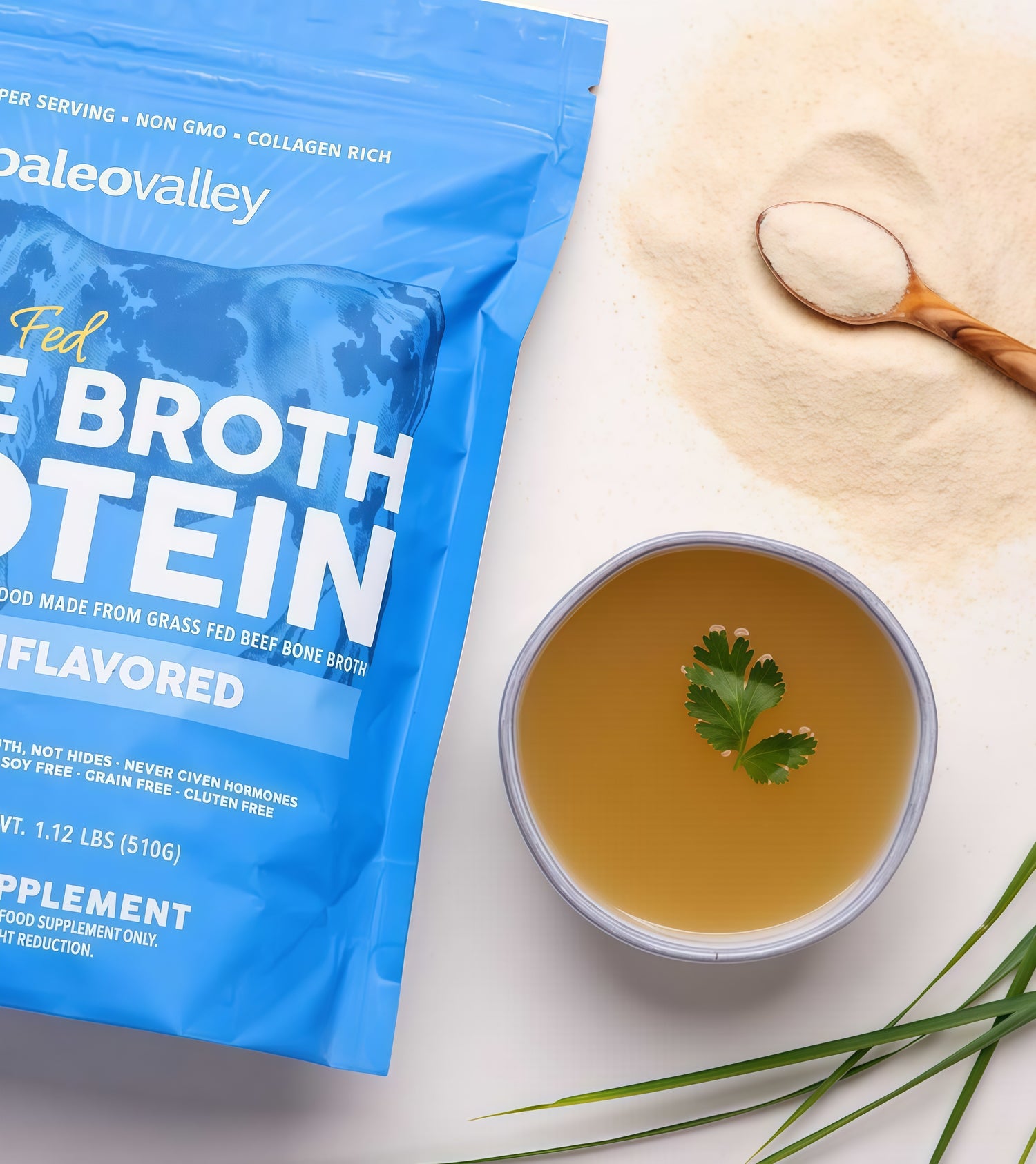 We created Paleovalley 100% Grass Fed Bone Broth Protein to make gettingcollagen-rich, bone broth proteininto your body faster, easier, and without having to source grass fed bones then simmer them for 48 hours. While we love bone broth, sometimes we just want something simple to add to an organic smoothie or cup of coffee or even our gluten-free baked dishes.