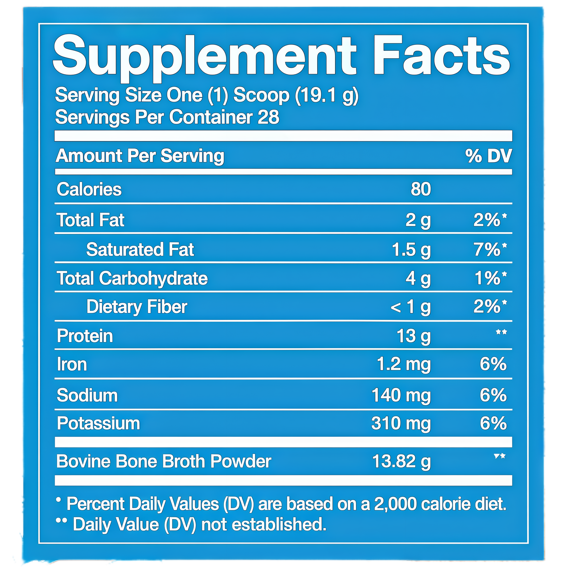 Our bone broth protein is made the same way you would make homemade broth – by simmering the bones until as many proteins and nutrients are extracted. Water and bones... that's it! We then use a gentle drying method to turn the broth into a powder.